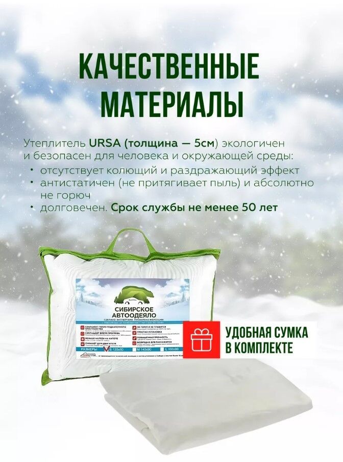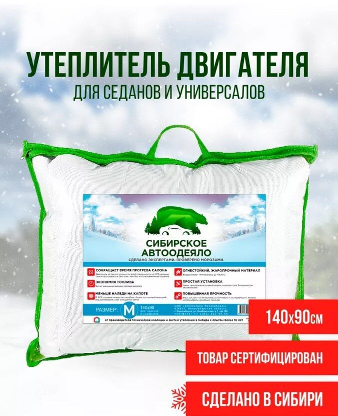 «Сибирское автоодеяло» — это утеплитель для двигателя, который обеспечивает надежную термоизоляцию моторного отсека и позволяет значительно сократить время прогрева двигателя. Выпускается в трех размерах, что позволяет подобрать его под любую марку легкового автомобиля. Изготовлено из экологически чистых материалов, товар сертифицирован. Долговечен и надежен, а также безопасен в использовании. Упакован в удобную сумку, что делает его отличным подарком для автомобилиста!