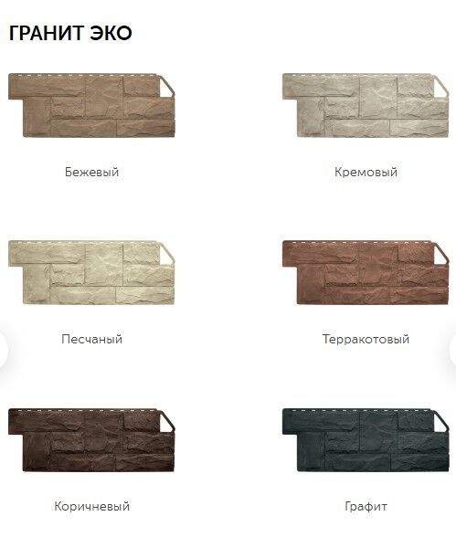 Крупные элементы, имитирующие сложную кладку из грубо отёсанных гранитных камней, идеально подходят для обшивки стен больших особняков, а также для оформления цокольной части дома. Фактура серии «Гранит ЭКО» видна с большого расстояния и отлично сочетается с сериями фасадных панелей мелких и средних фактур. Панели коллекции окрашены в массе в один цвет, что делает их более доступными по цене.