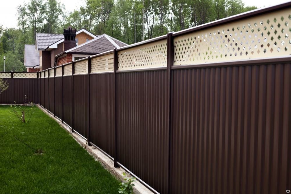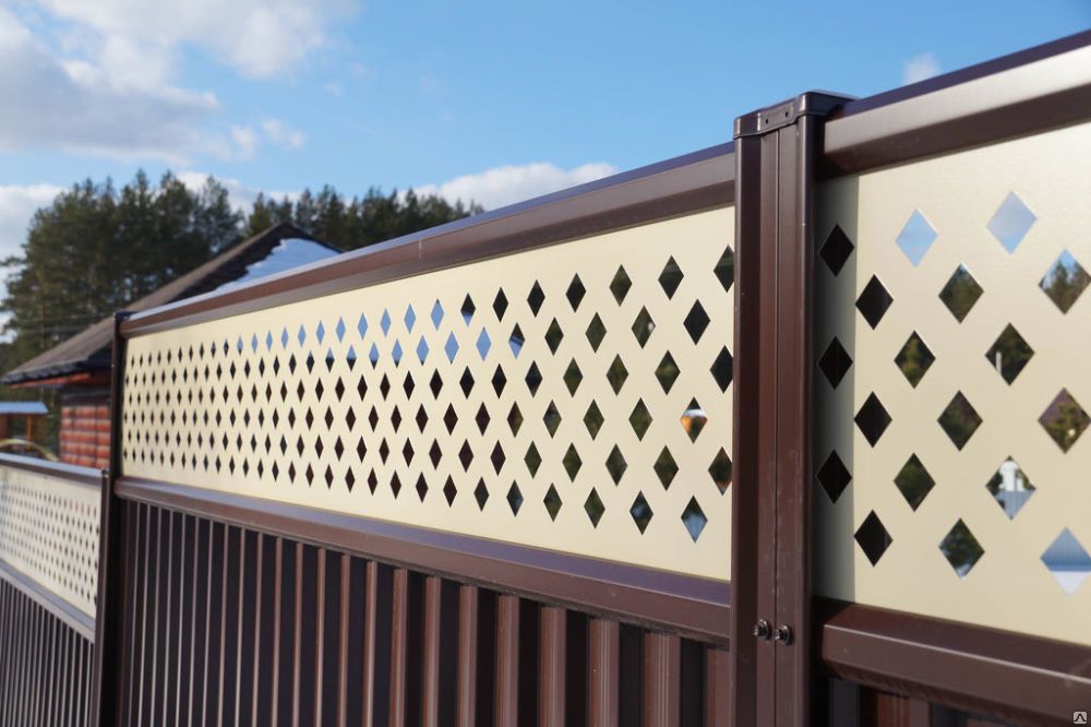Сочетание сплошного двустороннего профлиста и ромбовидного верхнего полотна придает ограждению легкость и защищенность.