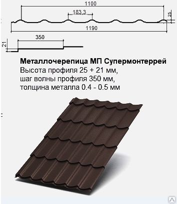 Металлочерепица Ламонтерра - это стальные листы с волнообразным профилем, имитирующим натуральную черепицу. Внутренняя сторона обработана защитным серым лаком, а лицевая - полимерным покрытием. Допустимый уклон крыши - 12 градусов.