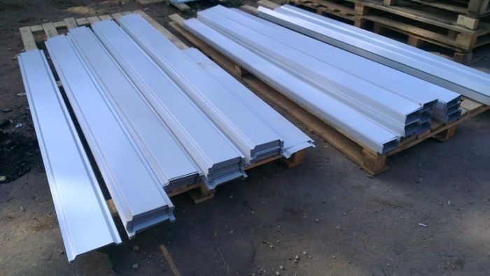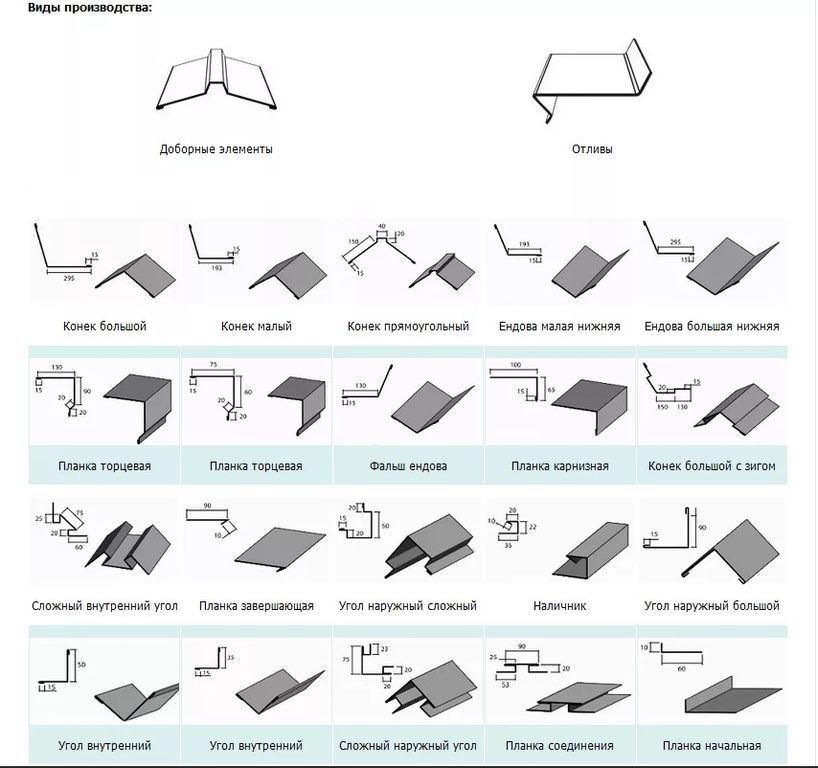 Виды изделий для сэндвич-панелей: коньки, планки стыковочные, торцевые, карнизные, примыкания, отливы для сэндвич-панелей, откосы, накладки для сэндвич-панелей.