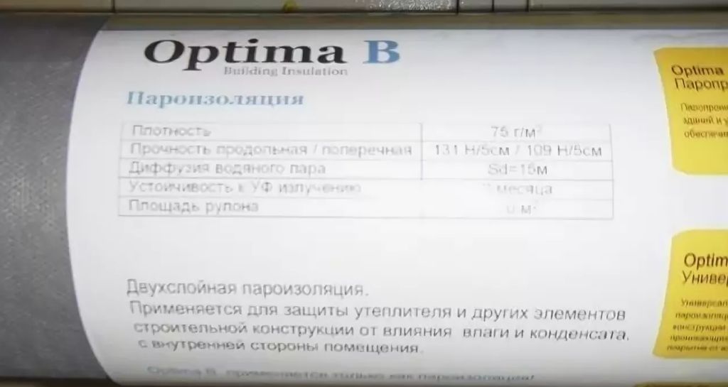 Пароизоляционная пленка Оптима В (Optima B) предназначена для защиты утеплителя и других элементов строительной конструкции от от проникновения влаги и конденсата из помещения наружу.